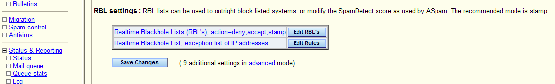 One of the best ways to fight spam is to use RBL's. RBL's are lists of servers that usually you don't want to talk to, sometimes they are lists of servers that are open relays or they are lists of servers that are proxies or maybe lists of servers that are dynamic ip's. There are many different types of RBL's out there so you might want to do some investigation before you deicde which ones to use. The idea is that when a server connects to your server SurgeMail will then check the RBL to see if the connecting server is listed, if it is then we can simply drop their connection or we can stamp the message to say its listed on a RBL and increase the ASPAM score. Using RBL's can dramatically decrease the amount of SPAM coming into your system and we highly recommend using them.