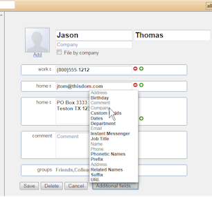 A good selection of additional fields are available for adding detailed contact information. For most fields, more than one can be defined and the "type" of each field is selectable, e.g. home, work, etc. Display and editing contact information is done within the right pane.