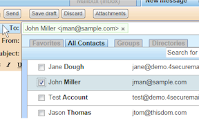 The picker allows quick selection of multiple recipients to your email. Click the To: button, optionally filter by search criteria, and select the addresses you want to add. Once added, contacts can be removed from the recipient list by clicking its small x.