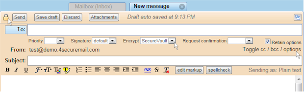 In the upper left corner, clicking the paddlelock closed will force encryption. Alternatively, you could open the message options by clicking 'options' on the right side just after 'Toggle cc / bcc /' and then selecting 'SecureVault' under the Encrypt drop-down menu. Doing it this way also allows you to save the Encrypt setting for future emails so you won't have to keep enabling it. Set the Retain options checkbox to save the settings.